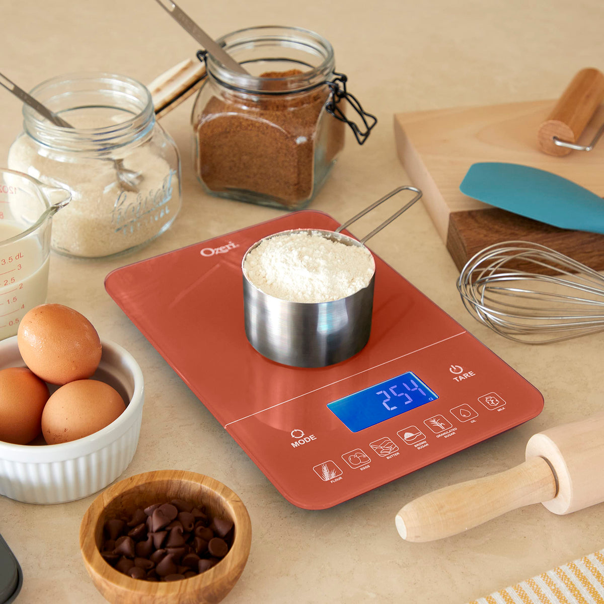 • Q: What features help with ingredient measurements? A: The scale features a touch-sensitive Tare button to subtract the weight of bowls or trays, and it provides low battery and overload indicators.
