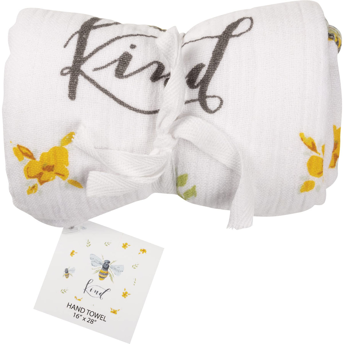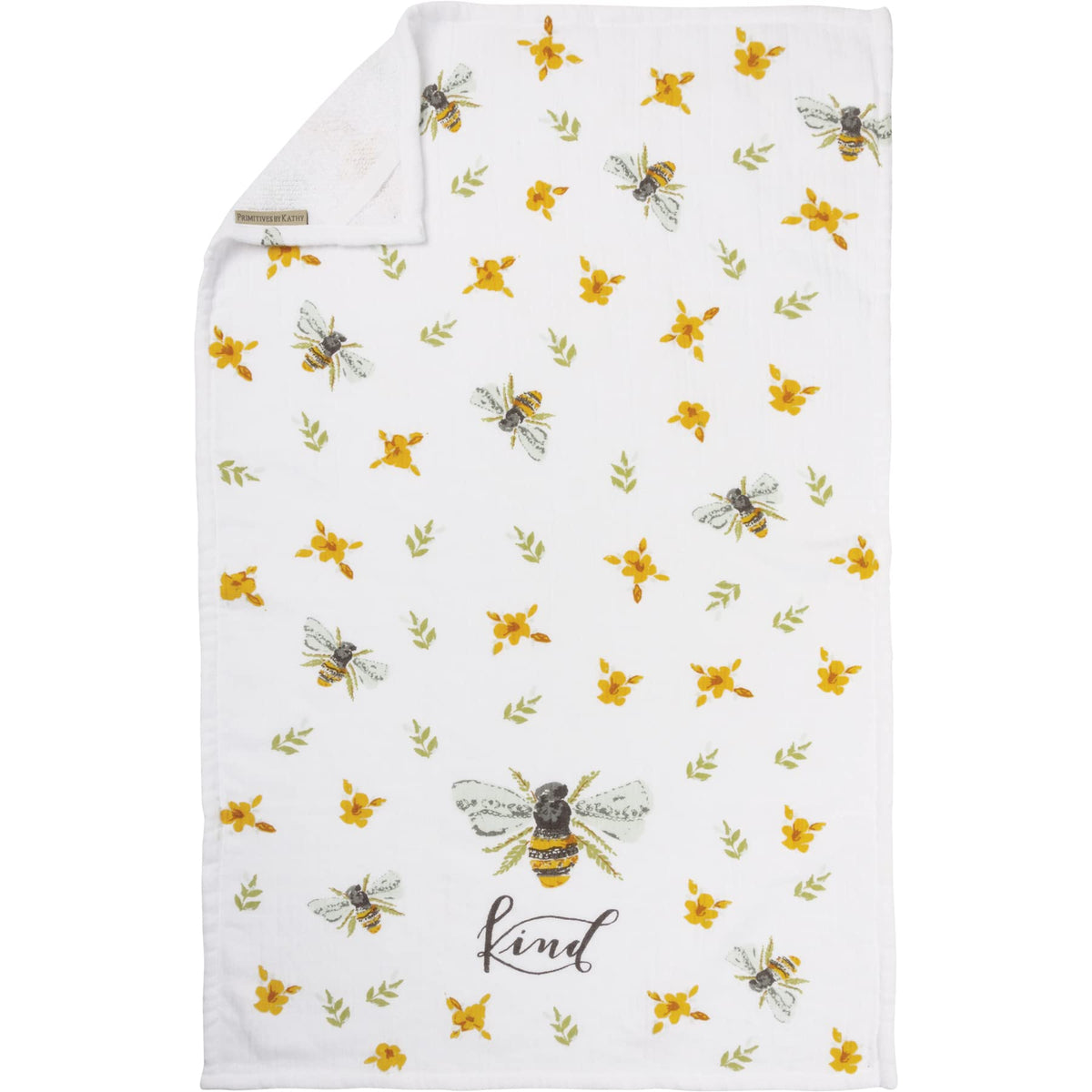 • Q: What design features does the towel have? A: The towel showcases unique watercolor bee and floral artwork along with a hand-lettered 'Kind' sentiment.