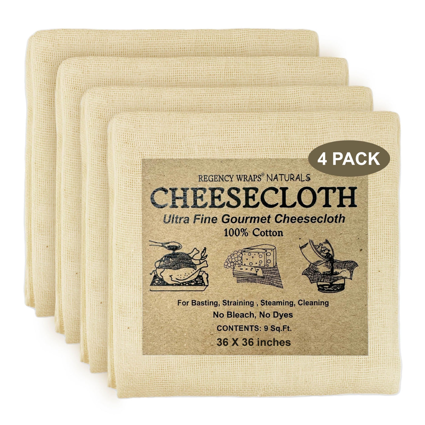 - Q: What is the size of the Regency Wraps Cheesecloth? A: The Regency Wraps Cheesecloth comes in a pack of 4, with each piece measuring 9 square feet.