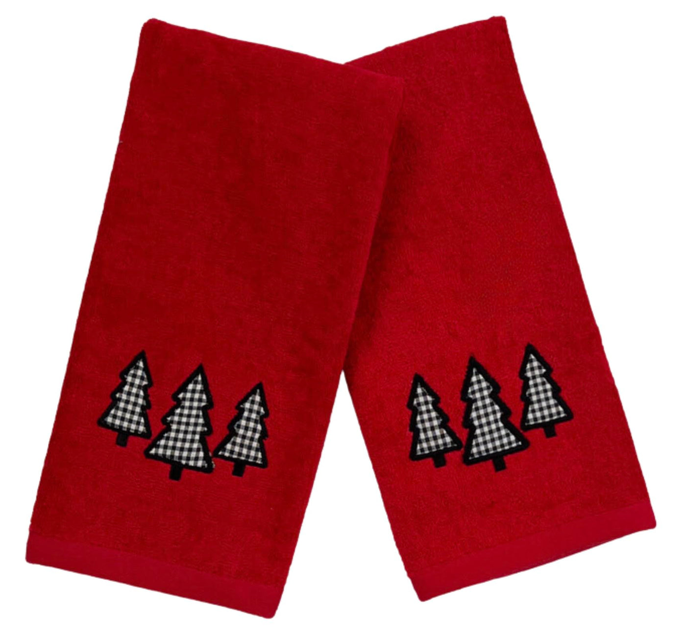 Serafina Home Holiday Christmas Guest Hand Towels: Country Farmhouse Red Terrycloth Towels With Check Tree Applique