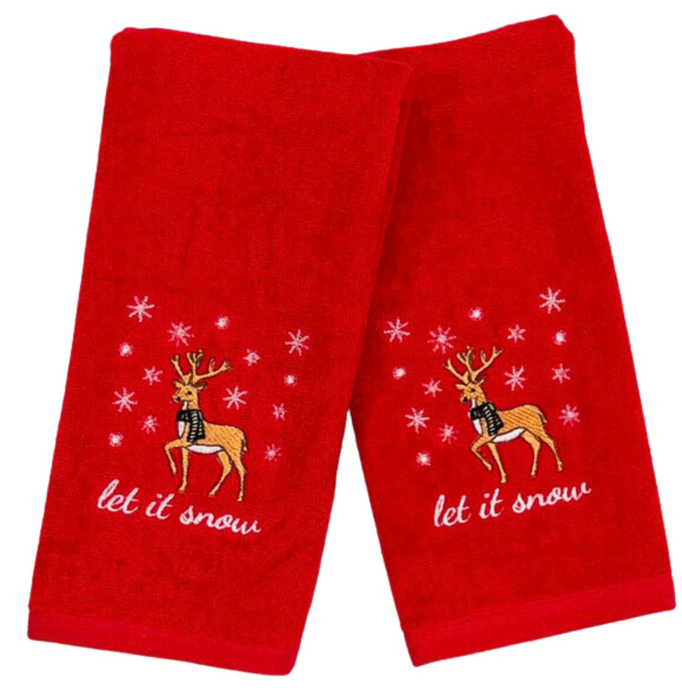 Serafina Home Holiday Christmas Guest Hand Towels: Country Farmhouse Red Terrycloth Towels With Reindeer Let It Snow Embroidered