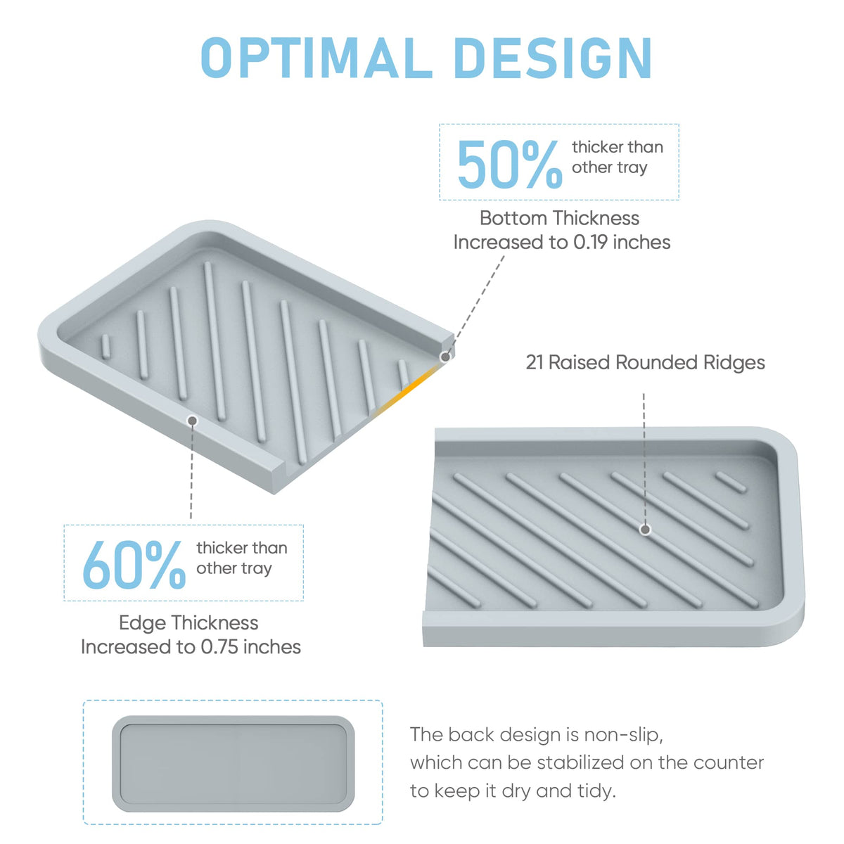- Q: How thick is the Silicone Sink Tray? A: The Silicone Sink Tray features a thickened design, with an edge thickness of 0.75 inches and a bottom thickness of 0.19 inches.