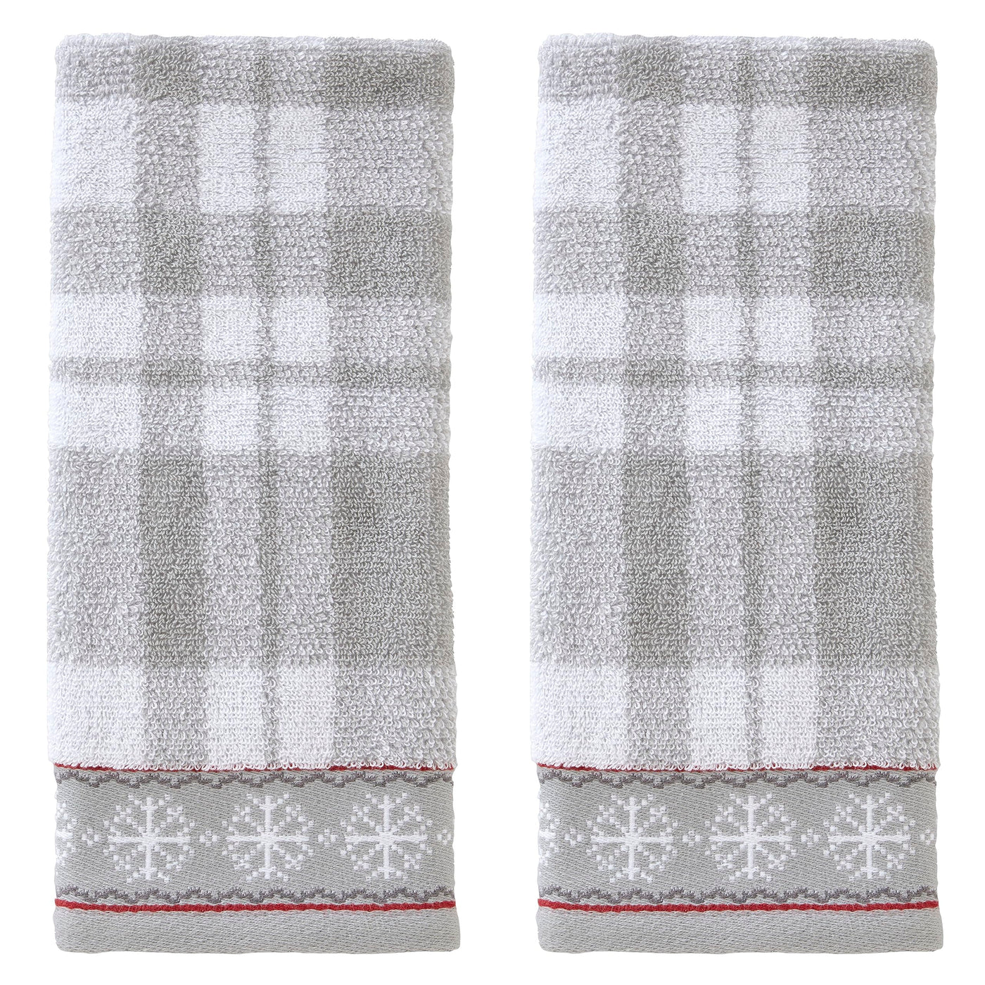- Q: What is the design of the towels? A: The towels feature a grey and white plaid jacquard pattern with a woven snowflake border along the hem.