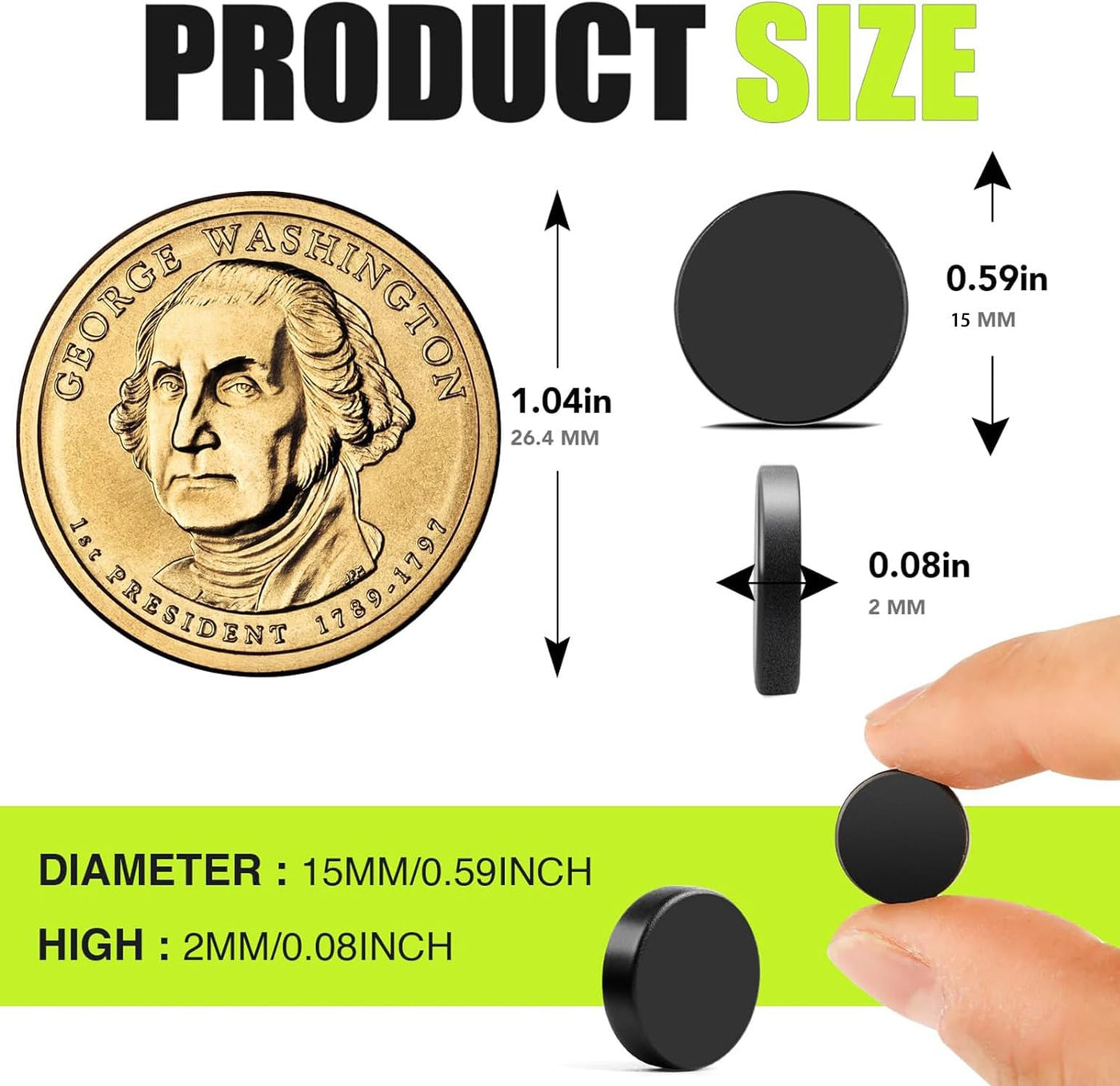 • Q: What are the dimensions of each magnet in the pack? A: Each magnet measures 15 millimeters in diameter and 2 millimeters in thickness.