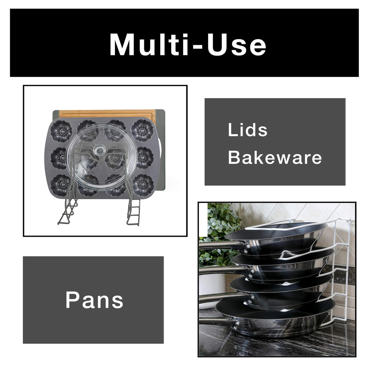 • Q: Can this rack be used for both lids and bakeware? A: Yes, the rack is designed to store lids and bakeware both vertically and horizontally, helping to eliminate kitchen clutter.