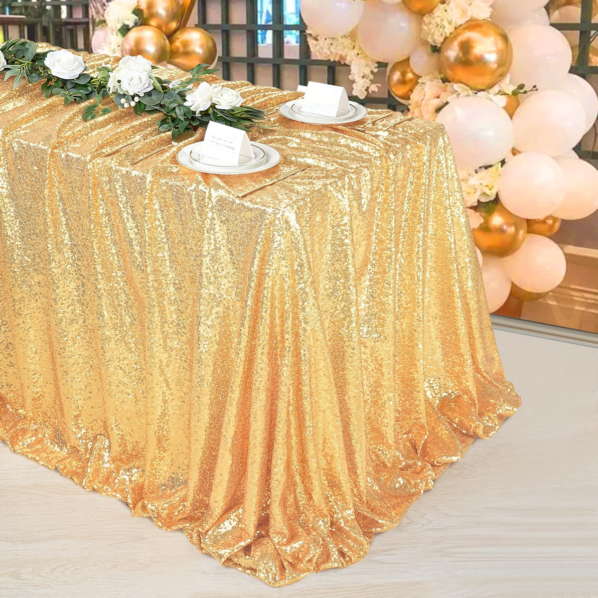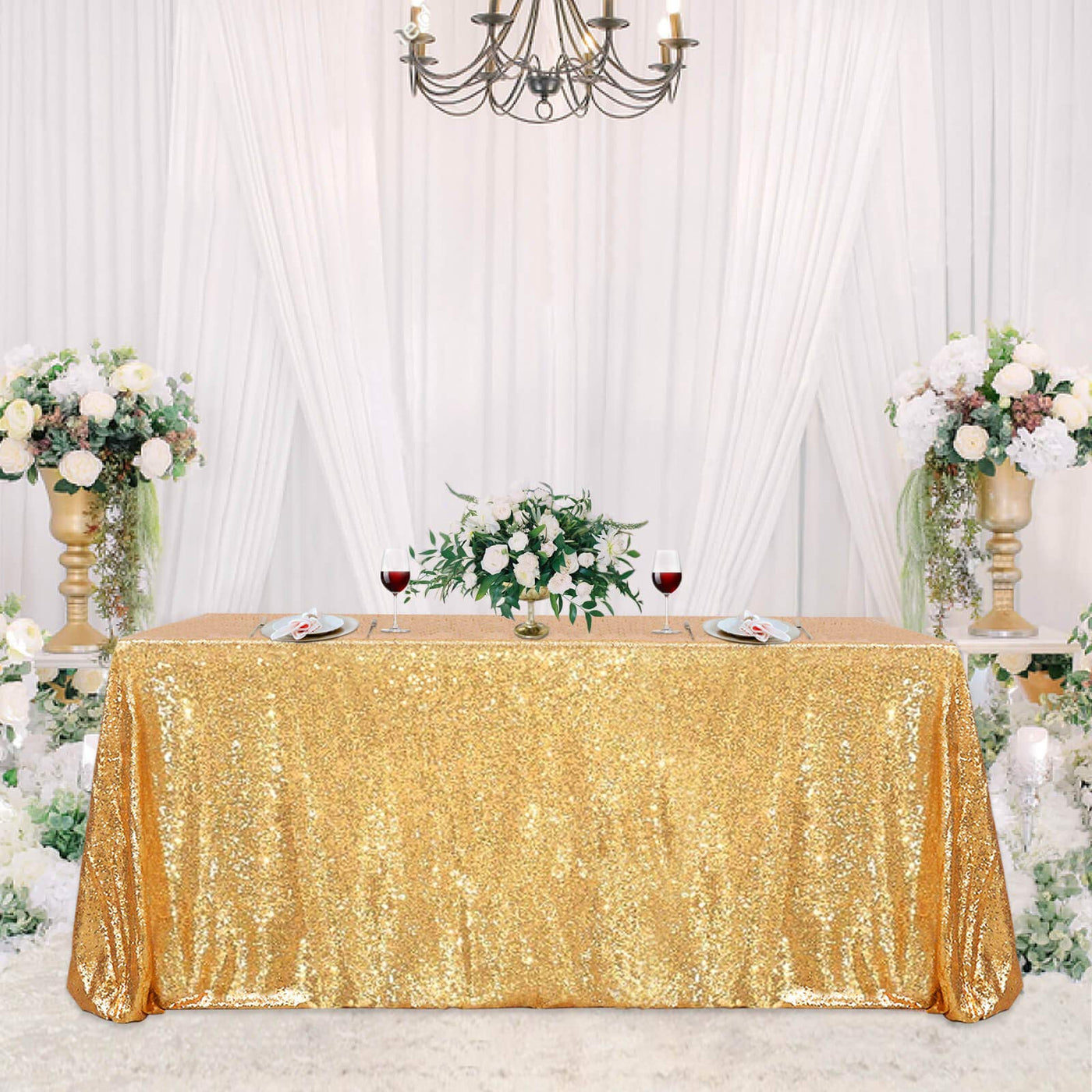 • Q: What are the dimensions of the Gold Sequin Tablecloth? A: The Gold Sequin Tablecloth measures 60 by 102 inches, making it suitable for rectangular tables.
