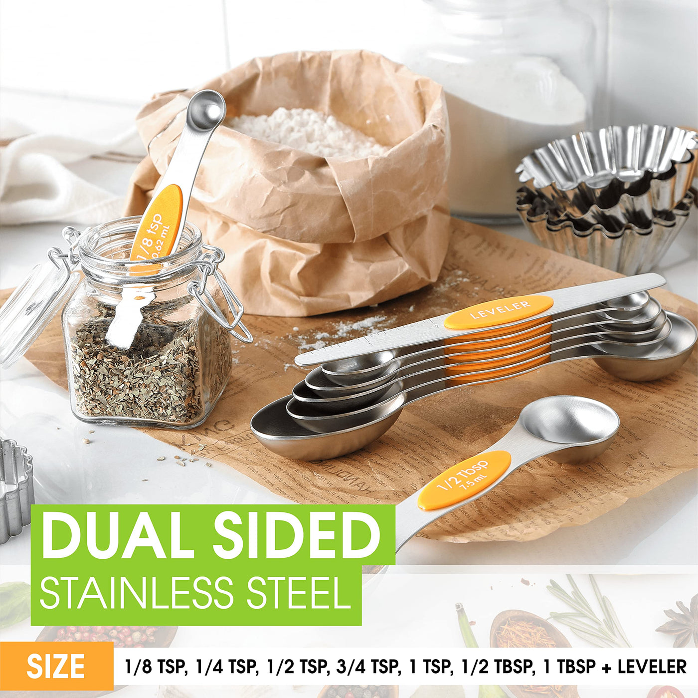 Spring Chef Magnetic Measuring Spoons Set, Dual Sided, Stainless Steel, Fits In Spice Jars, Mango, Set Of 8, 2 Pack