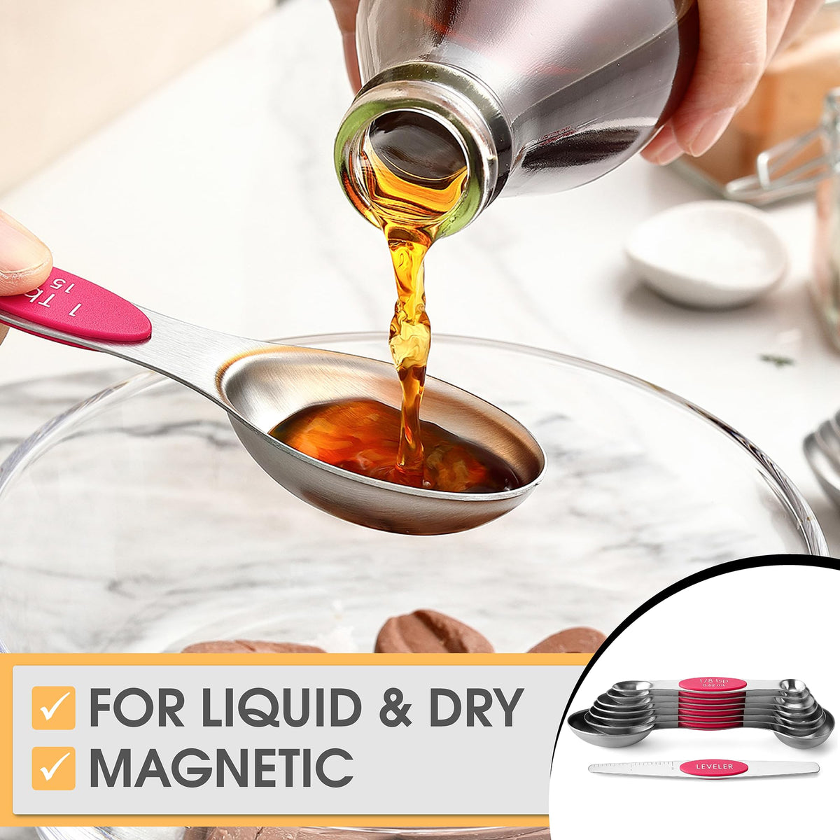 Spring Chef Magnetic Measuring Spoons Set, Dual Sided, Stainless Steel, Fits In Spice Jars, Pink, Set Of 8, 2 Pack