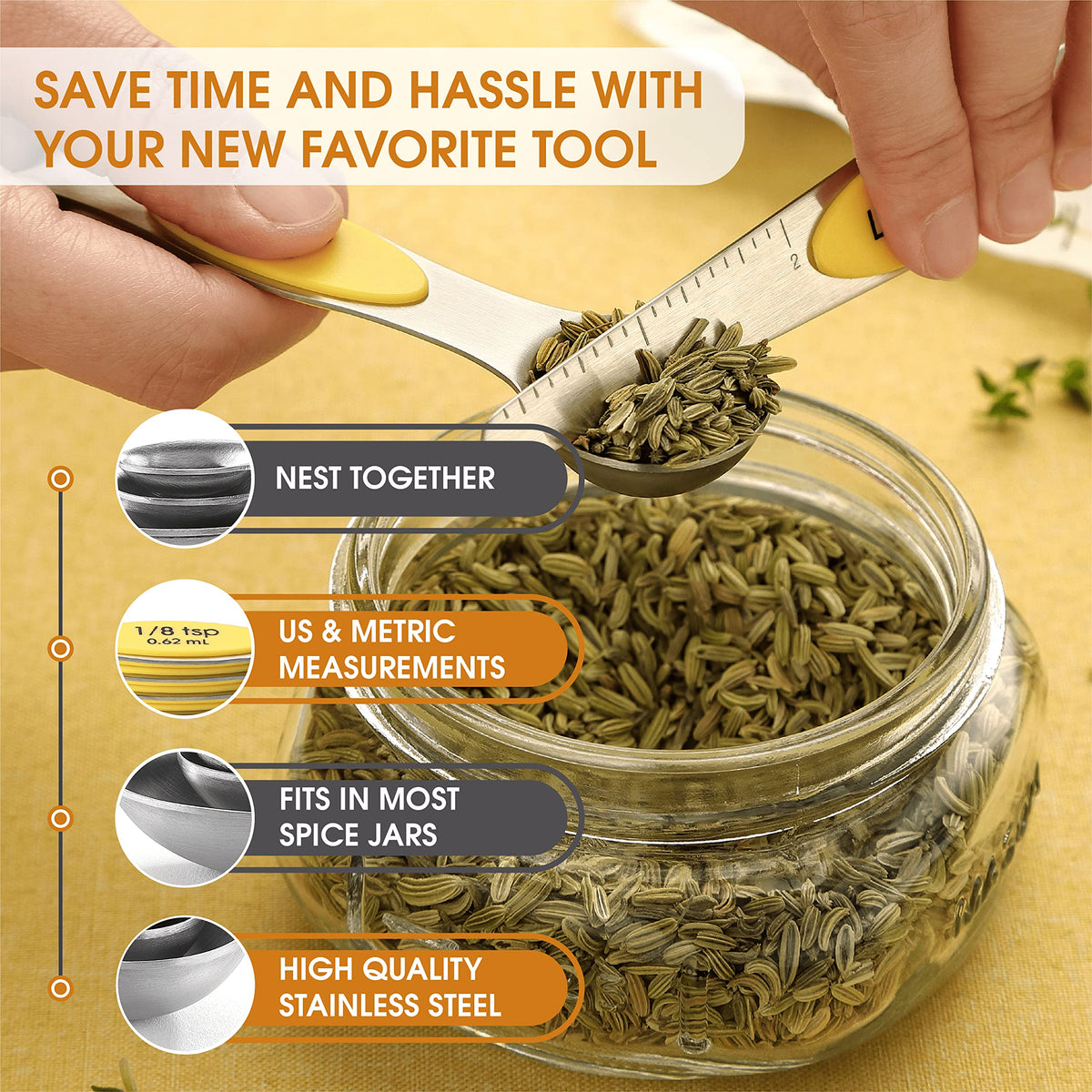 Spring Chef Yellow Stainless Steel Magnetic Measuring Spoons Set Of 8 With Leveler, Dual Sided Metal Teaspoon & Tablespoon Measu