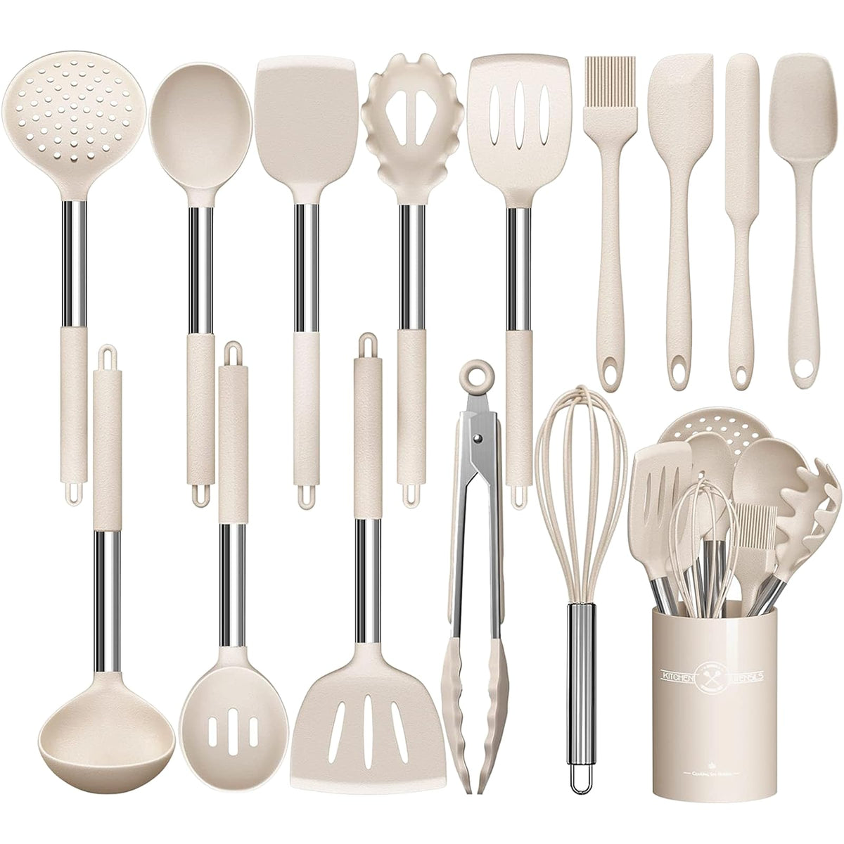 - Q: What types of cooking tasks can the utensils help with? A: The utensils are versatile and can be used for various cooking tasks, such as flipping, stirring, serving, and whisking, making them suitable for all your kitchen needs.