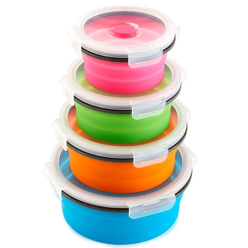 • Q: What materials are the collapsible food storage containers made of? A: The collapsible food storage containers are made of silicone and polypropylene.