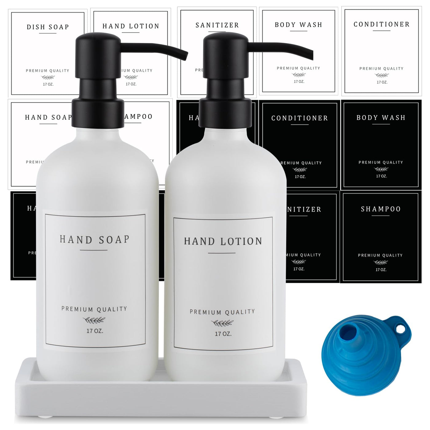 - Q: What is included in the Thick Glass Soap Dispenser set? A: The set includes two lead-free glass soap dispensers, two black stainless steel pumps, a collapsible silicone funnel, a waterproof soap dispenser tray, and seven waterproof stickers for labeling purposes.