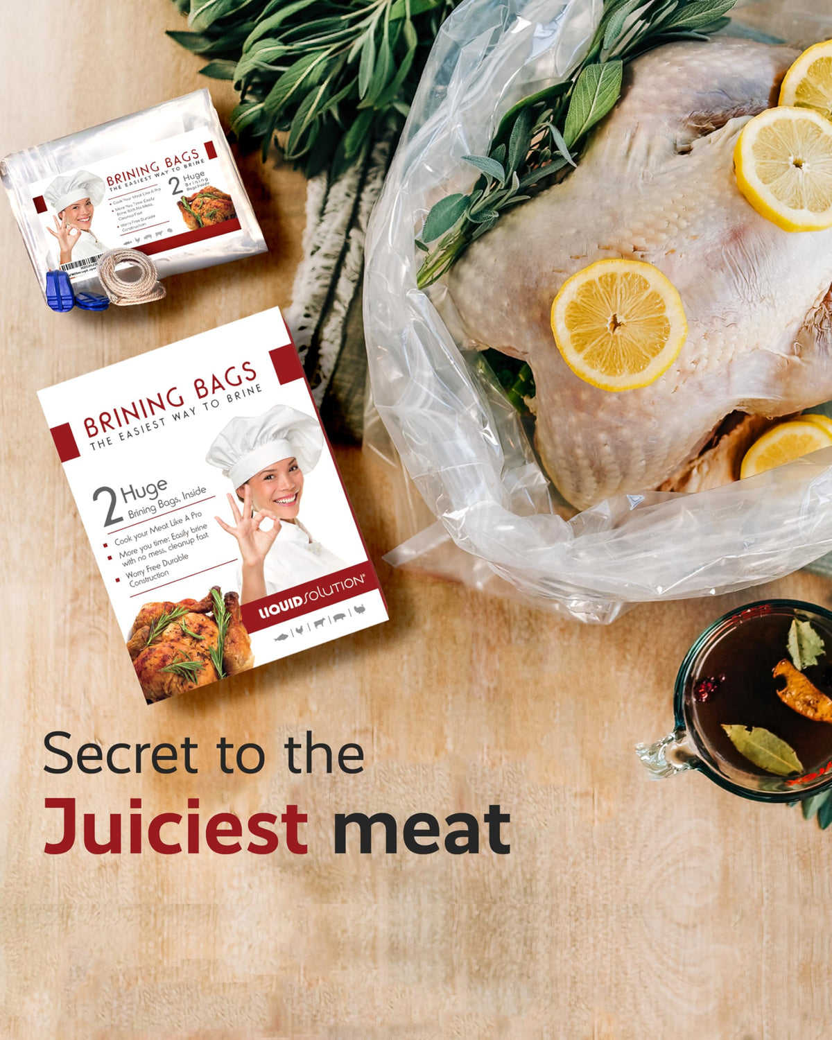 Proven Technique: Brining helps achieve a juicy, flavorful turkey by allowing it to absorb moisture and seasoning; the process enhances the turkeys moisture retention and internal seasoning. | Everything Included: This set includes two extra-large brining bags with wide gusseted bottoms for added stability, double-track zippers, two removable zipper assist clips for easy closure, and two 18-inch strings of twine for trussing your turkey. | Free from Breakage: Made from heavy-duty, BPA-free, food-grade materials, these brining bags feature thick seams for durability; designed to handle weights over 40 pounds without leakage, tears, or rips, ensuring a secure and mess-free roasting experience. | Multipurpose Use: These 21.5 inches x 25.5 inches bags are suitable for large turkeys and a variety of other meats, including wild game, ham, roast, and deer; durable materials and seams allow for safe marinating and disposal of bones and food waste. | Reliable Kitchen Companion: Liquid Solution has been a trusted choice for various kitchen tasks, including turkey brining, helping to ensure delicious results every time.