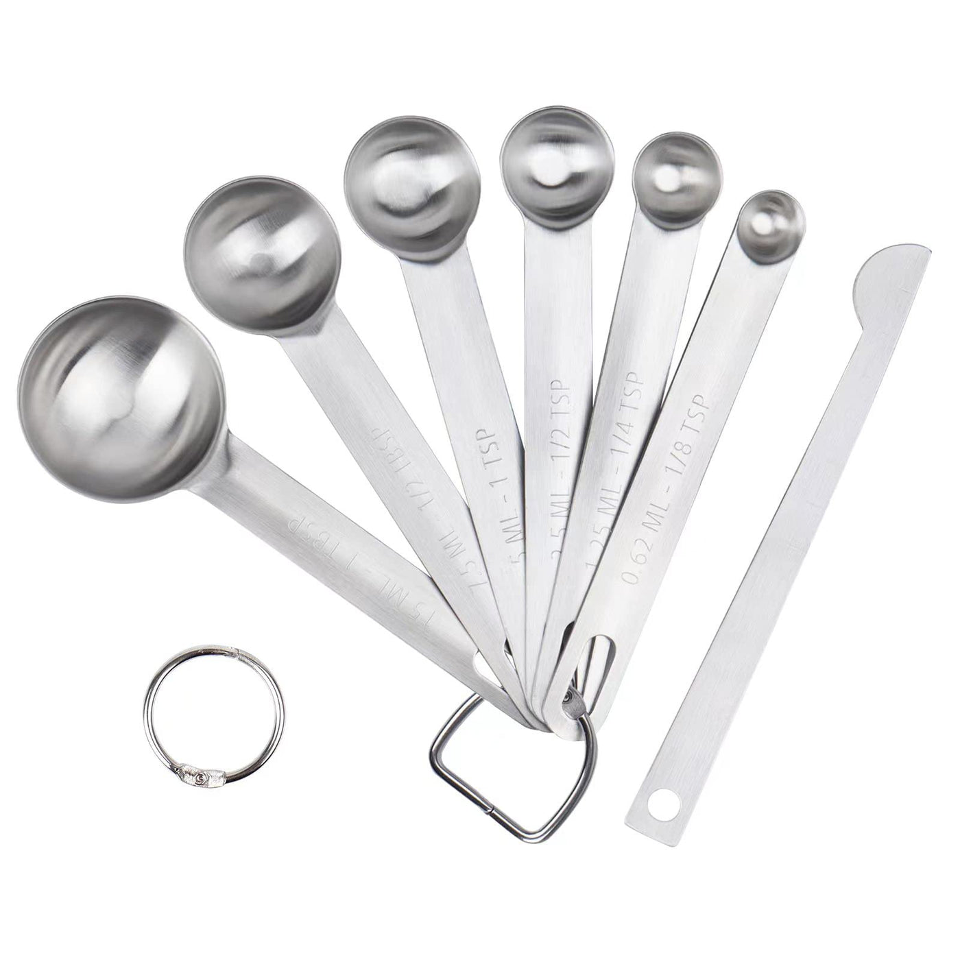 - Q: What sizes are included in the measuring spoons set? A: The set includes six metal measuring spoons: 1/8 teaspoon, 1/4 teaspoon, 1/2 teaspoon, 1 teaspoon, 1/2 tablespoon, and 1 tablespoon, along with a bonus scraper.