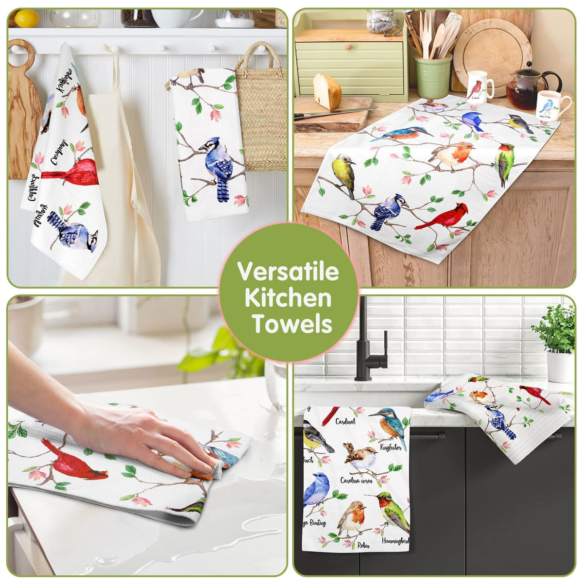 • Q: What types of birds are featured on the kitchen towels? A: The towels feature illustrations of various birds including bluejay, hummingbird, cardinal, robin, goldfinch, carolina wren, kingfisher, chickadee, and indigo bunting.