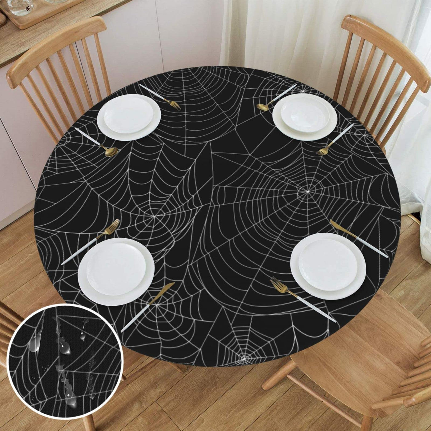 • Q: What is the design of the table cover? A: The table cover features a chic Halloween-themed design with black bats and spider webs, adding a festive touch to your decor.