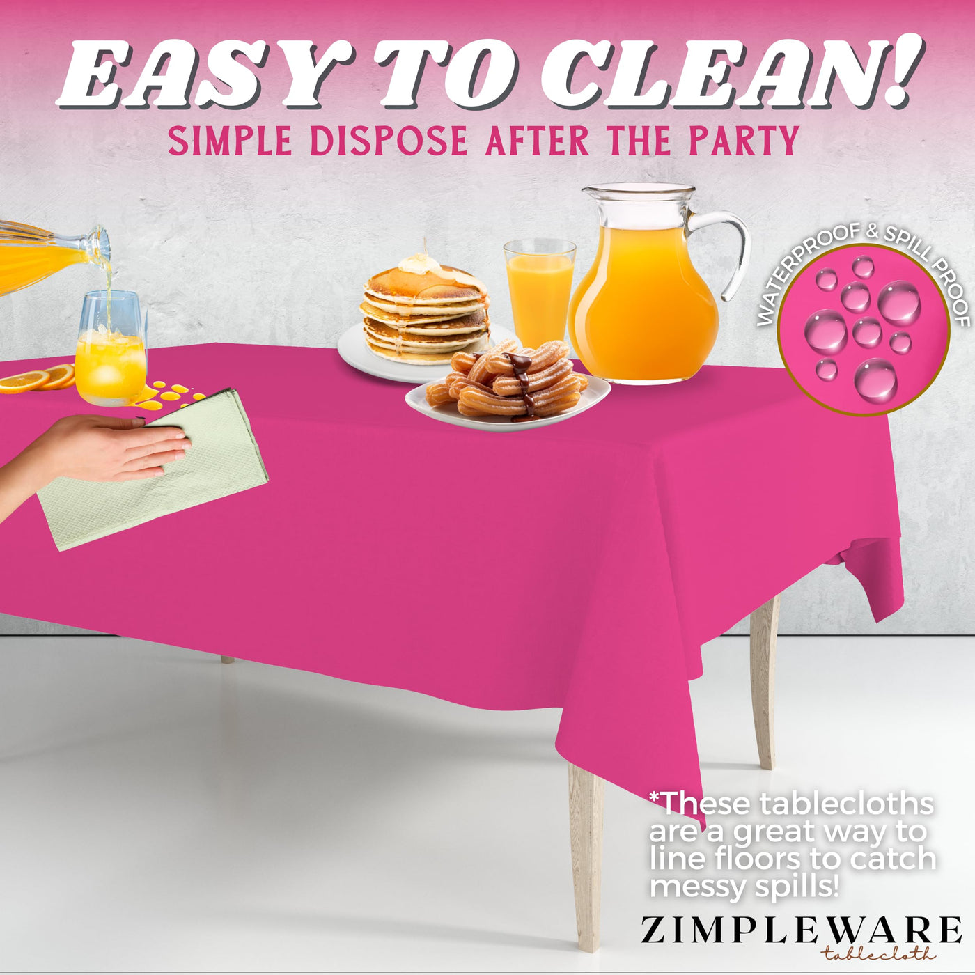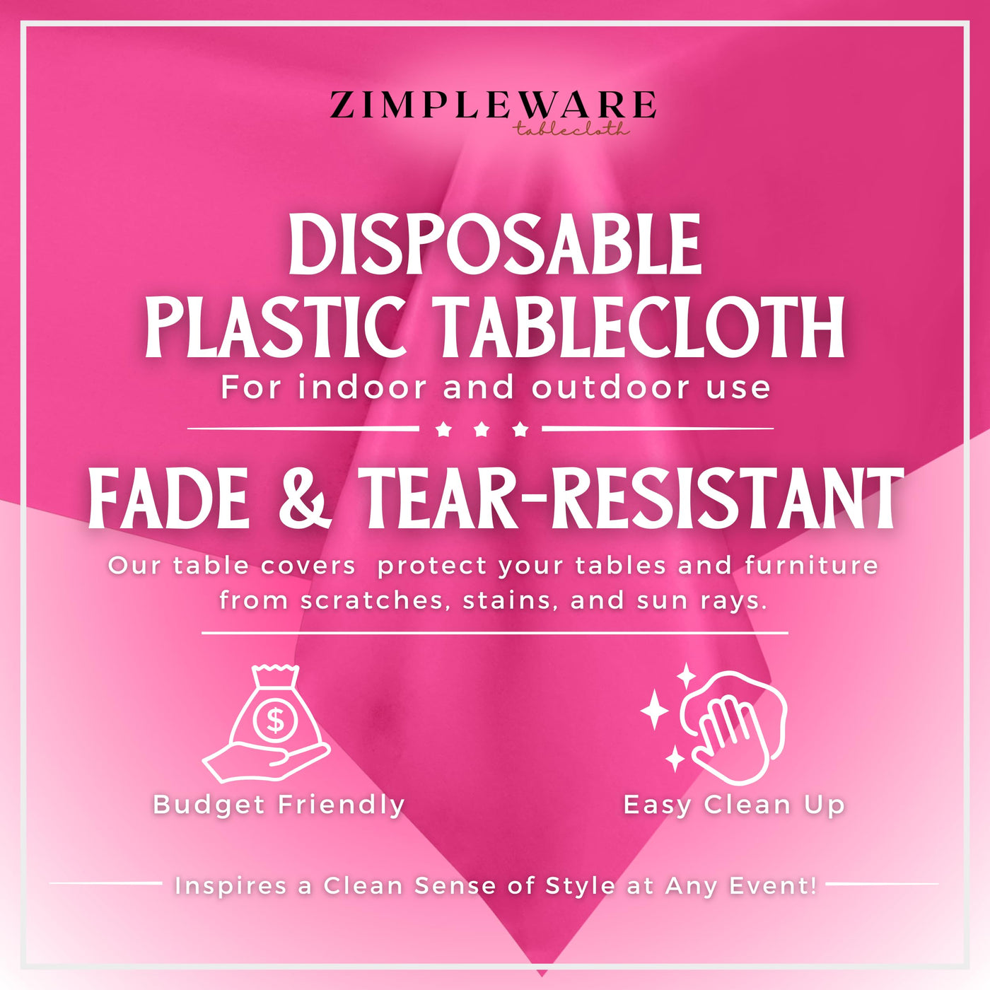 • Q: What are the dimensions of the ZIMPLEWARE Hot Pink Disposable Plastic Party Tablecloth? A: The ZIMPLEWARE Hot Pink Disposable Plastic Party Tablecloth measures 54 inches by 108 inches, making it suitable for standard rectangular tables.