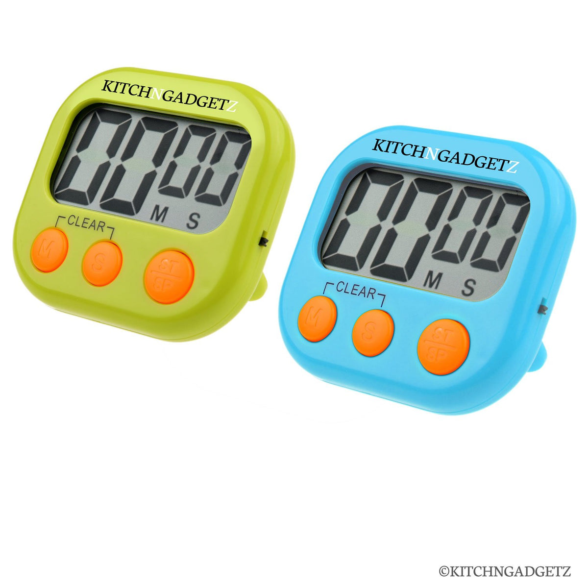 - Q: How many clocks are included in this product? A: This product includes a set of 2 digital kitchen clocks, one in blue and one in green.