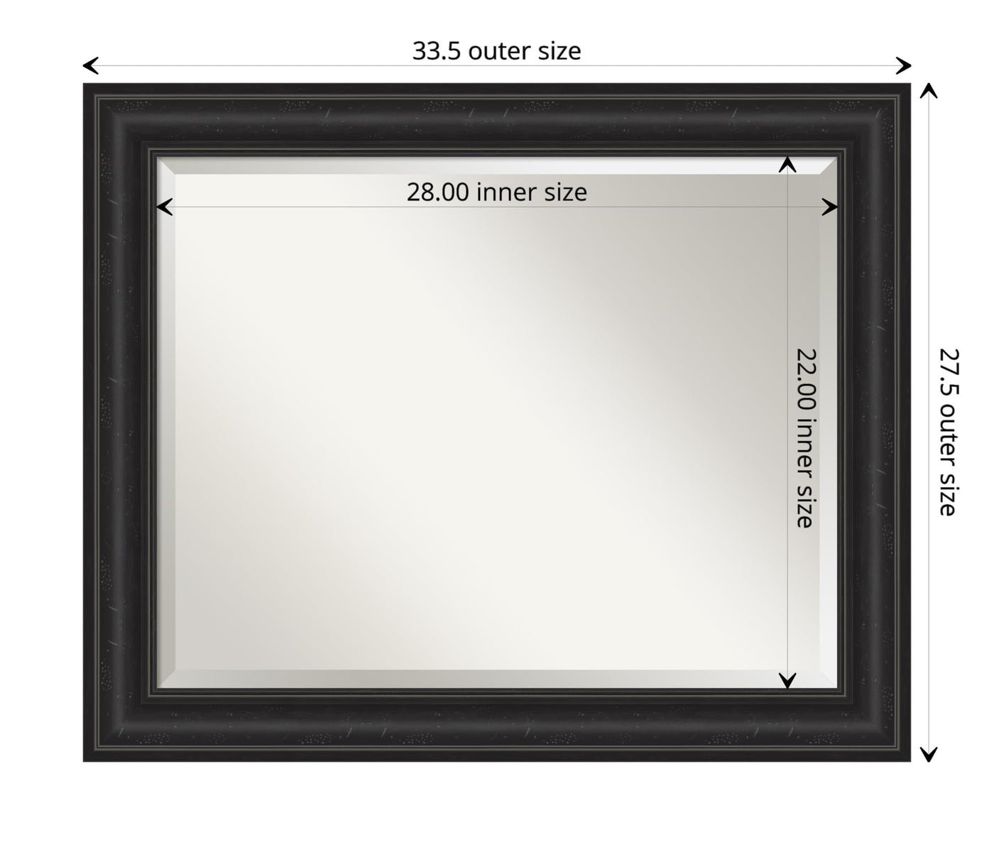 - Q: What are the dimensions of the Amanti Art Black Bathroom Mirror? A: The overall dimensions of the Amanti Art Black Bathroom Mirror are thirty-three and a half inches by twenty-seven and a half inches.