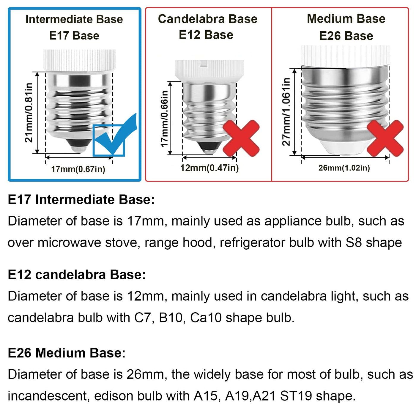 • Q: What type of base does this bulb have? A: This LED bulb features an E17 intermediate screw base, making it compatible with various kitchen appliances and fixtures.