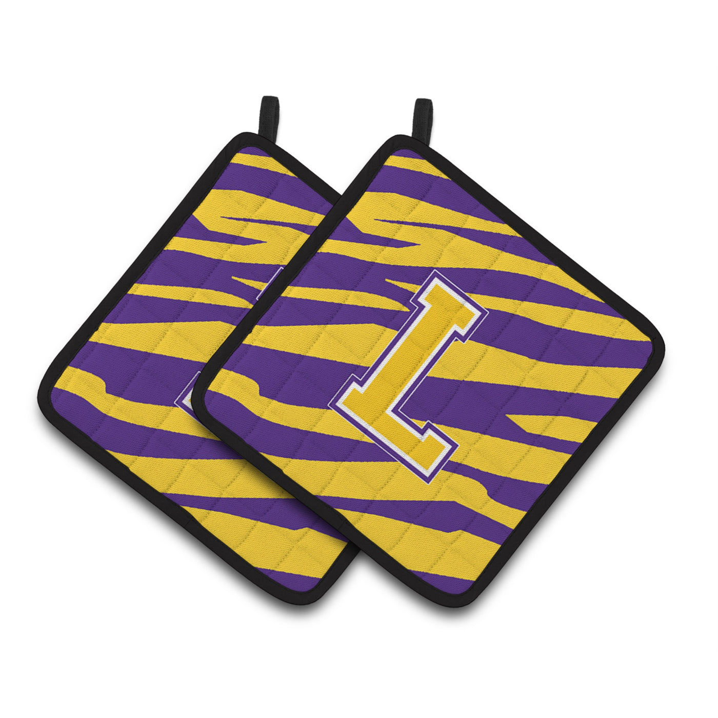 'Caroline's Treasures Letter L Monogram - Tiger Stripe - Purple Gold Pair of Pot Holders CJ1022-LPTHD 7.5HX7.5W Multicolor''
