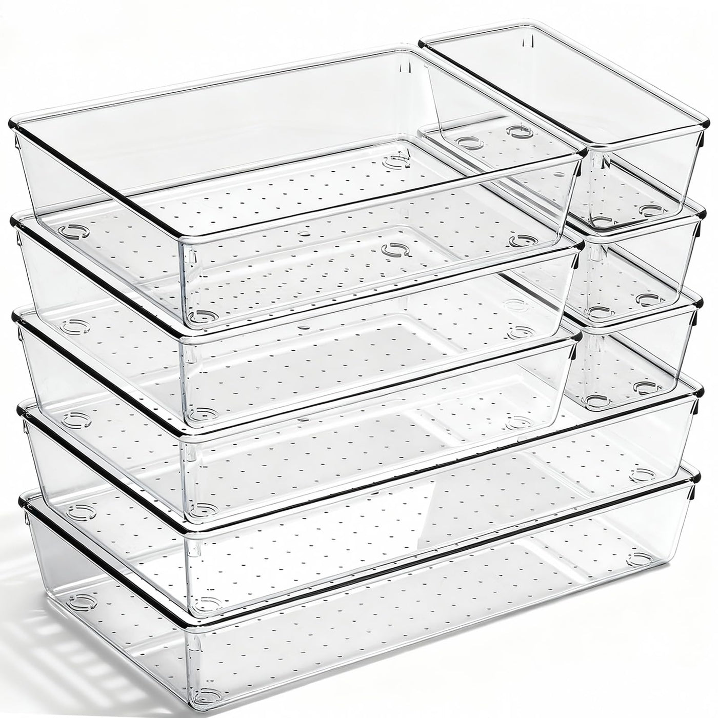 CHOWAY 8 Pack Large Clear Plastic Drawer Organizer Trays - Acrylic Kitchen Drawer Dividers for Utensils - 3 Sizes Heavy Duty Home Organization Bins for Bathroom, Makeup, Bedroom, Office Gadgets, Home Essentials