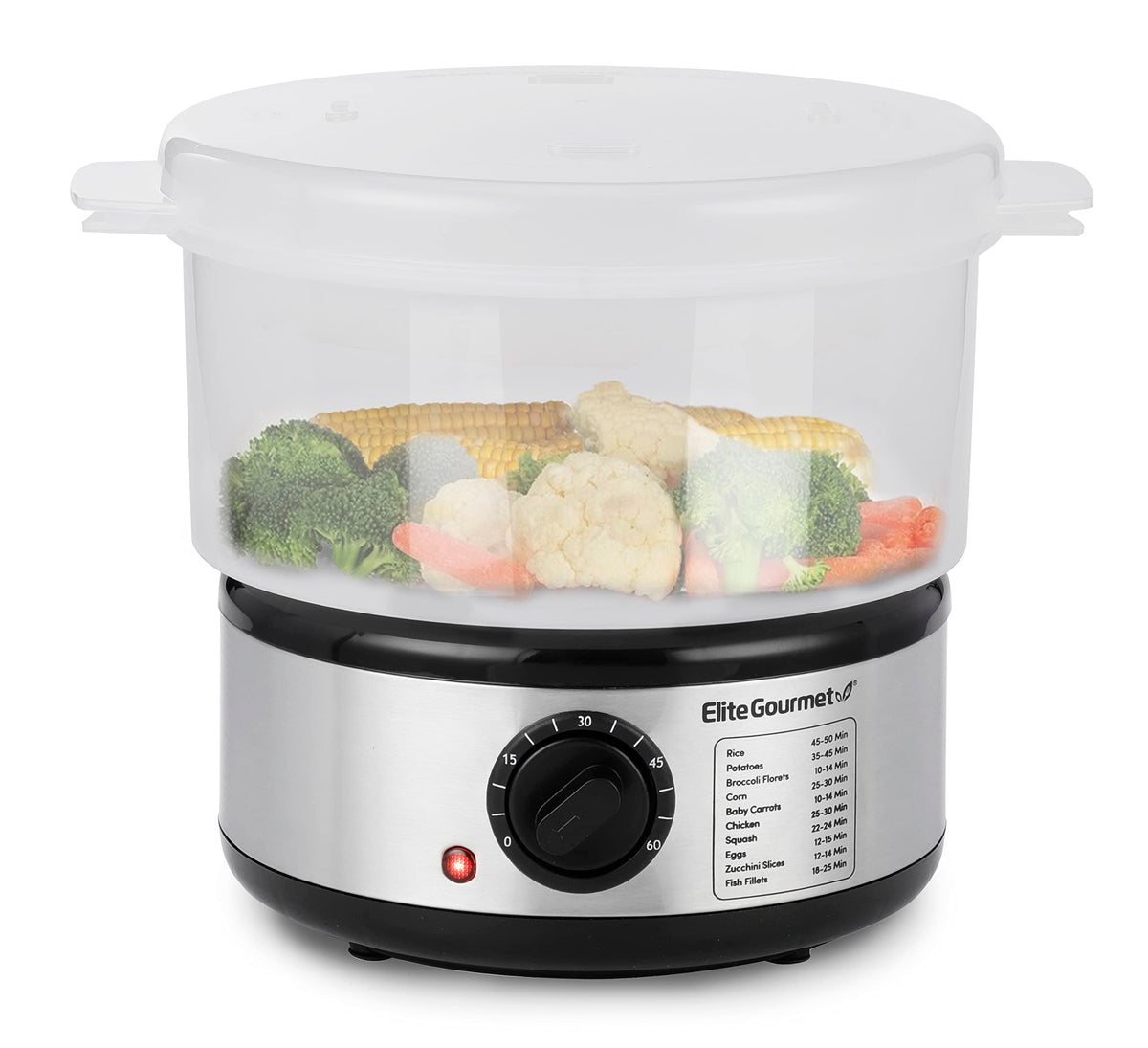 - Q: What materials is the Elite Gourmet Food Steamer made of? A: The steamer is primarily made of stainless steel, providing durability and a sleek appearance.