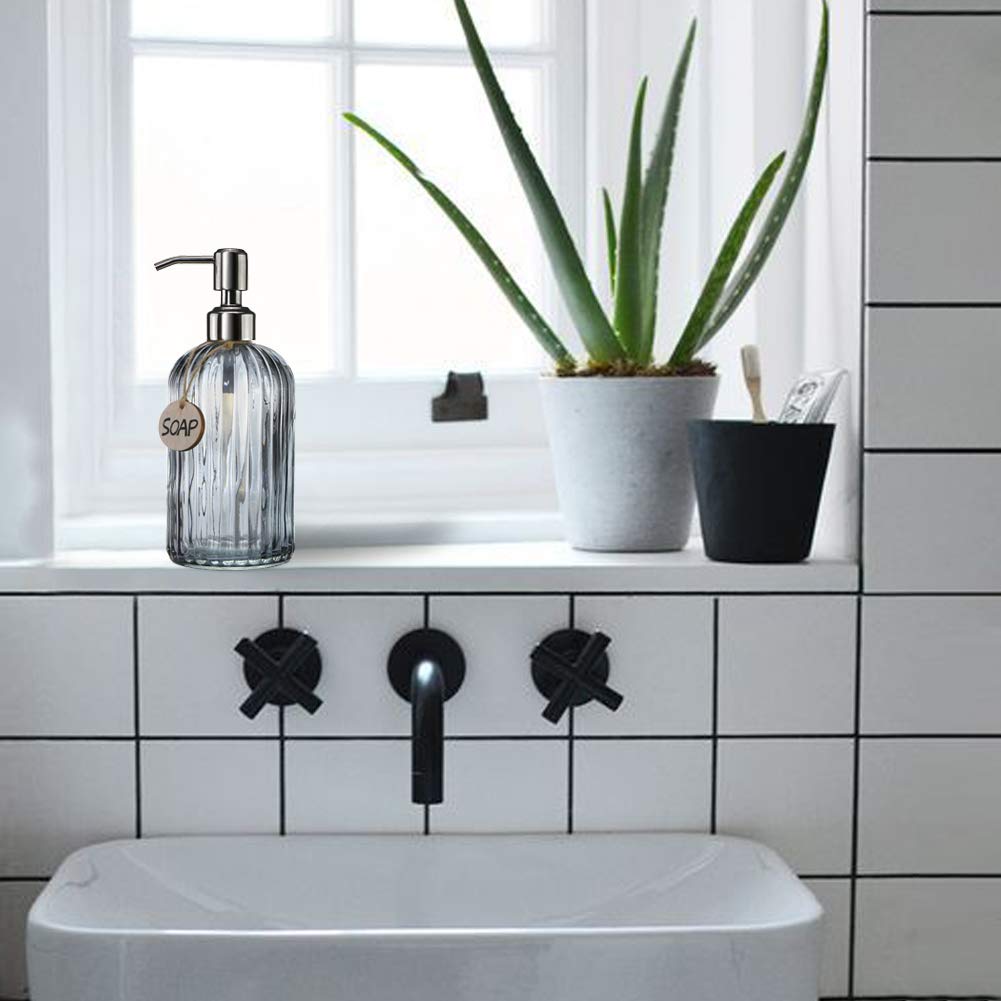JASAI 18 Oz Vertical Stripes Kitchen Soap Dispenser with 304 Rust Proof Stainless Steel Pump Refillable Liquid Soap Dispenser for Bathroom Kitchen Hand Soap Dish Soap (Clear Grey)