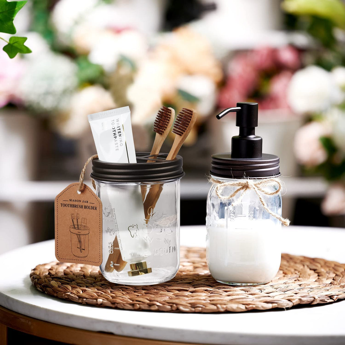 - Q: What decor styles does this toothbrush holder fit into? A: The Amolliar Mason Jar Toothbrush Holder complements various decor styles such as rustic, farmhouse, western, and contemporary decor.