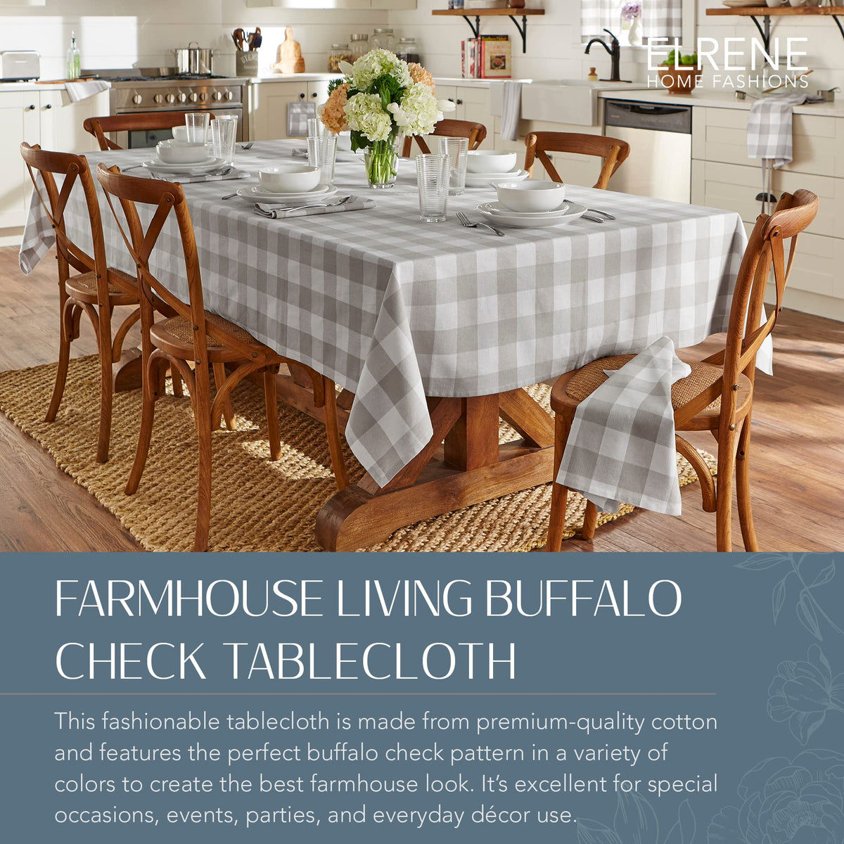 • Q: What are the dimensions of the Elrene Home Fashions Buffalo-Check Tablecloth? A: The Elrene Home Fashions Buffalo-Check Tablecloth measures 60 inches by 102 inches.
