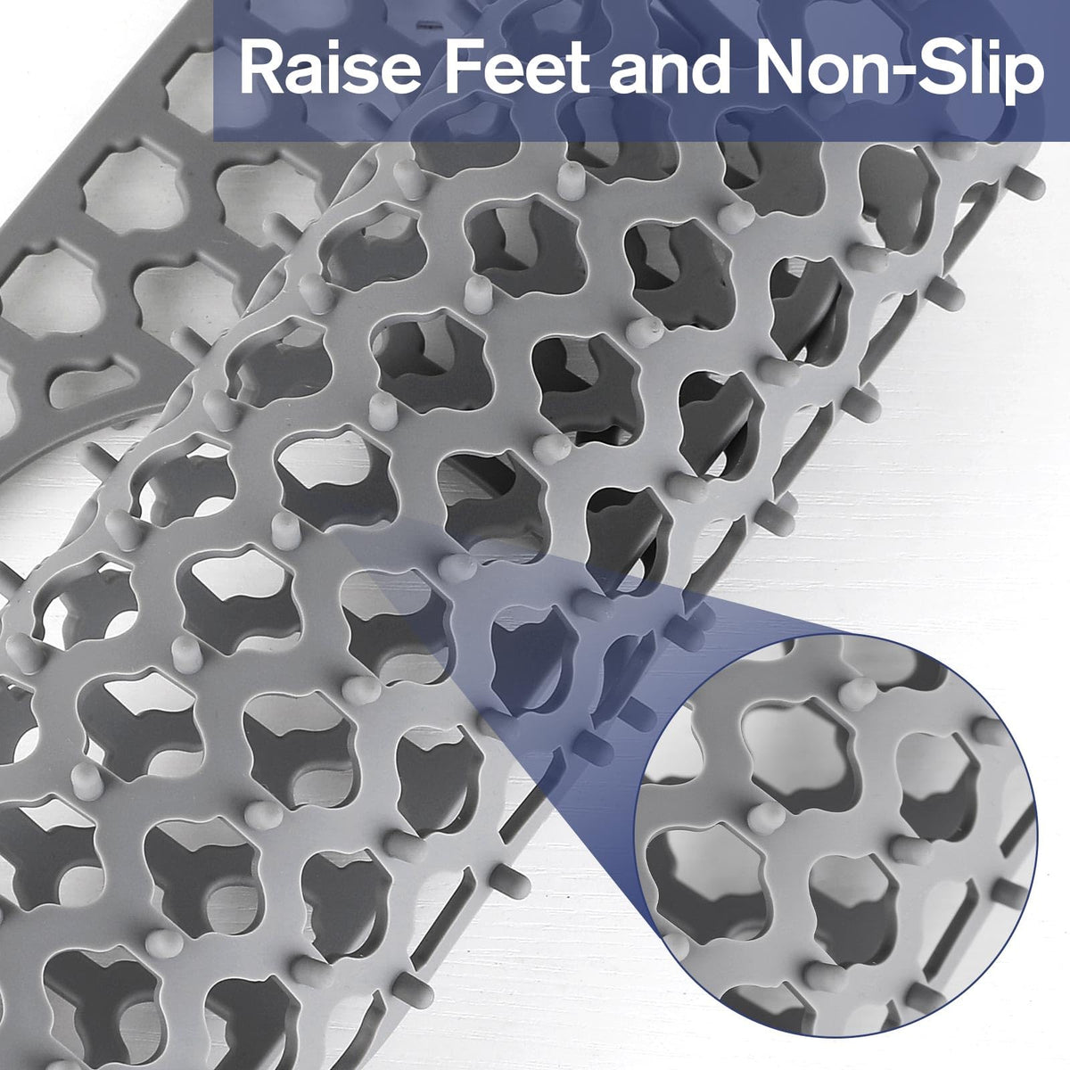 • Q: How does the raised feet feature benefit the sink protector? A: The raised feet on the bottom of the sink protector prevent sliding and elevate it slightly off the sink bottom, allowing for better drainage and ventilation.