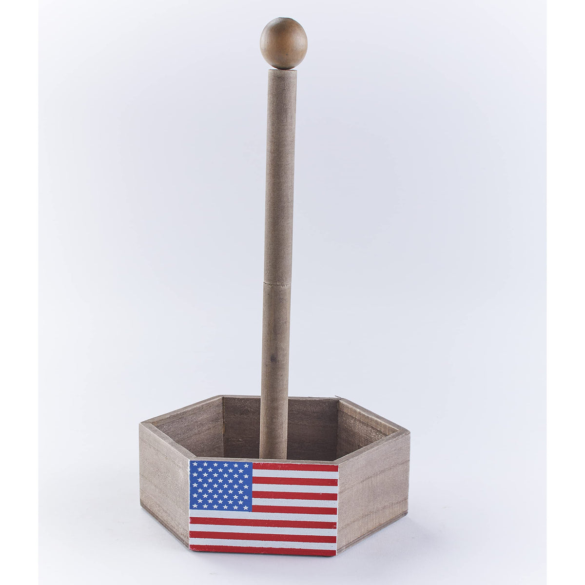 • Q: What is the design theme of the paper towel holder? A: The paper towel holder features a rustic Americana design, embellished with an American flag, making it a great addition to patriotic decor.