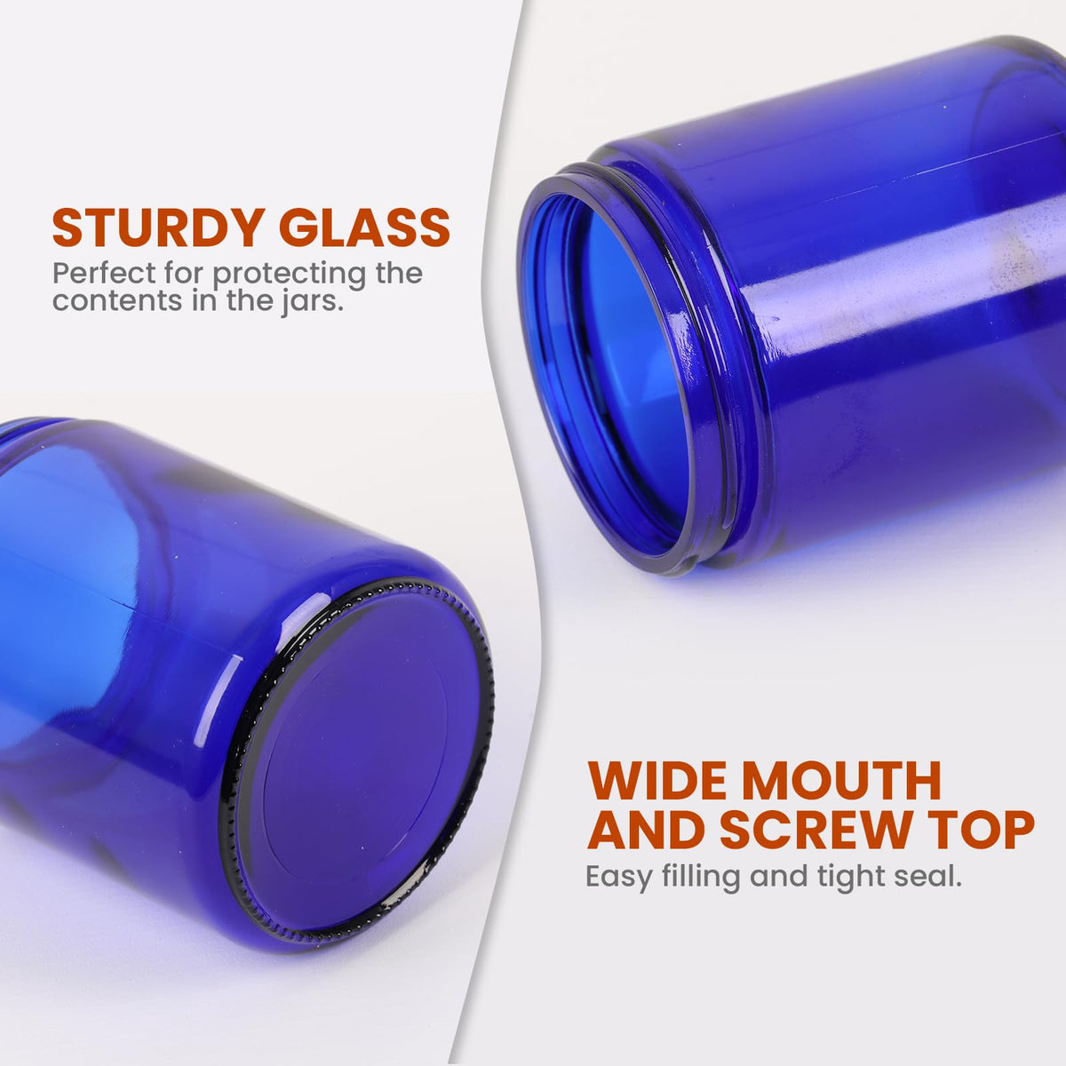 • Q: What are the dimensions of the 8 oz Blue Round Glass Jars? A: The jars have a capacity of 8 ounces and are designed in a round shape, making them versatile for various uses.