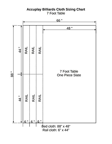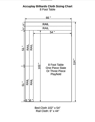 • Q: What size is the Accuplay pool table felt? A: The Accuplay pool table felt is precut to a size of 60 inches by 111 inches, suitable for a 9-foot table.