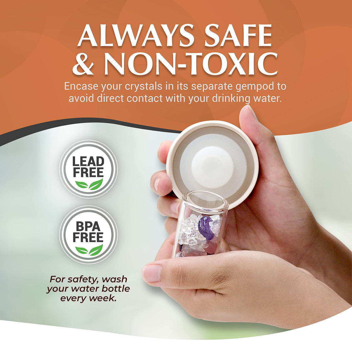 - Q: How does the crystal infusion work? A: The crystals are contained in a separate gem pod that prevents direct contact with the water or tea, allowing their positive energy to infuse the liquid without compromising safety.