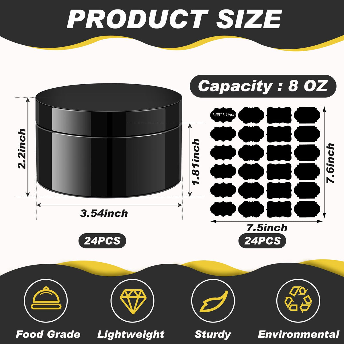 - Q: How many jars are included in the package? A: The package contains 24 black jars along with 24 corresponding labels.