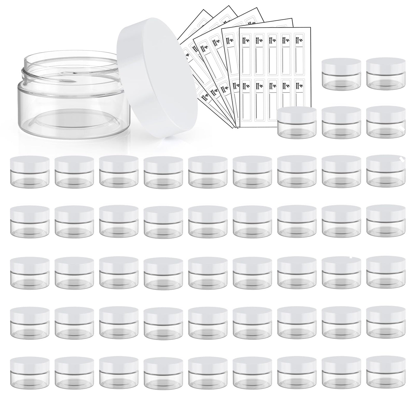 - Q: How many jars come in a pack? A: Each pack contains 50 clear 1 oz plastic jars with white lids, along with 50 labels and 5 spatulas.