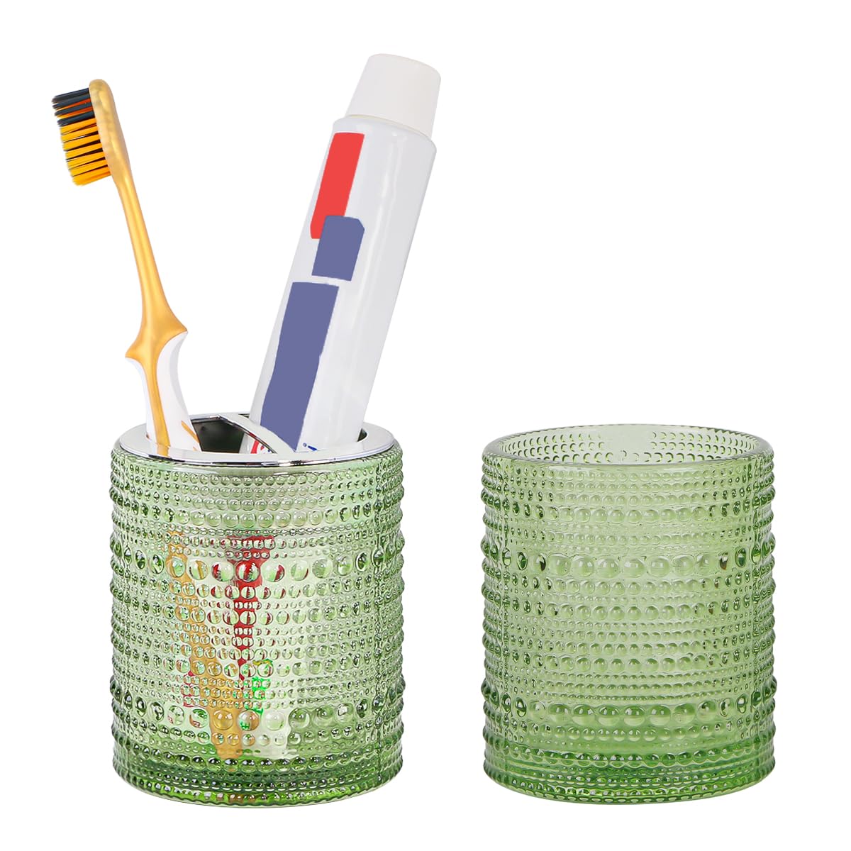 Specifications: Material:Made of glass,durable and reliable,easy to clean; Color:Clear; Dimensions:3.5 x 3.1 inch; Apply for: Toothbrush holder; Mouthwash Cup; Makeup brush holder; Bathroom accessories organizer jar; Desk pens holder; Feature: Dots design, easy to grab,not easy to slip out of hands; Anti-slip bottom design,not easy tip over even if toothpaste in it; Multi-functional bathroom vanity canister; Packing Including: 1 x Glass Toothbrush Holder; 1 x Glass Mouthwash Cup;
