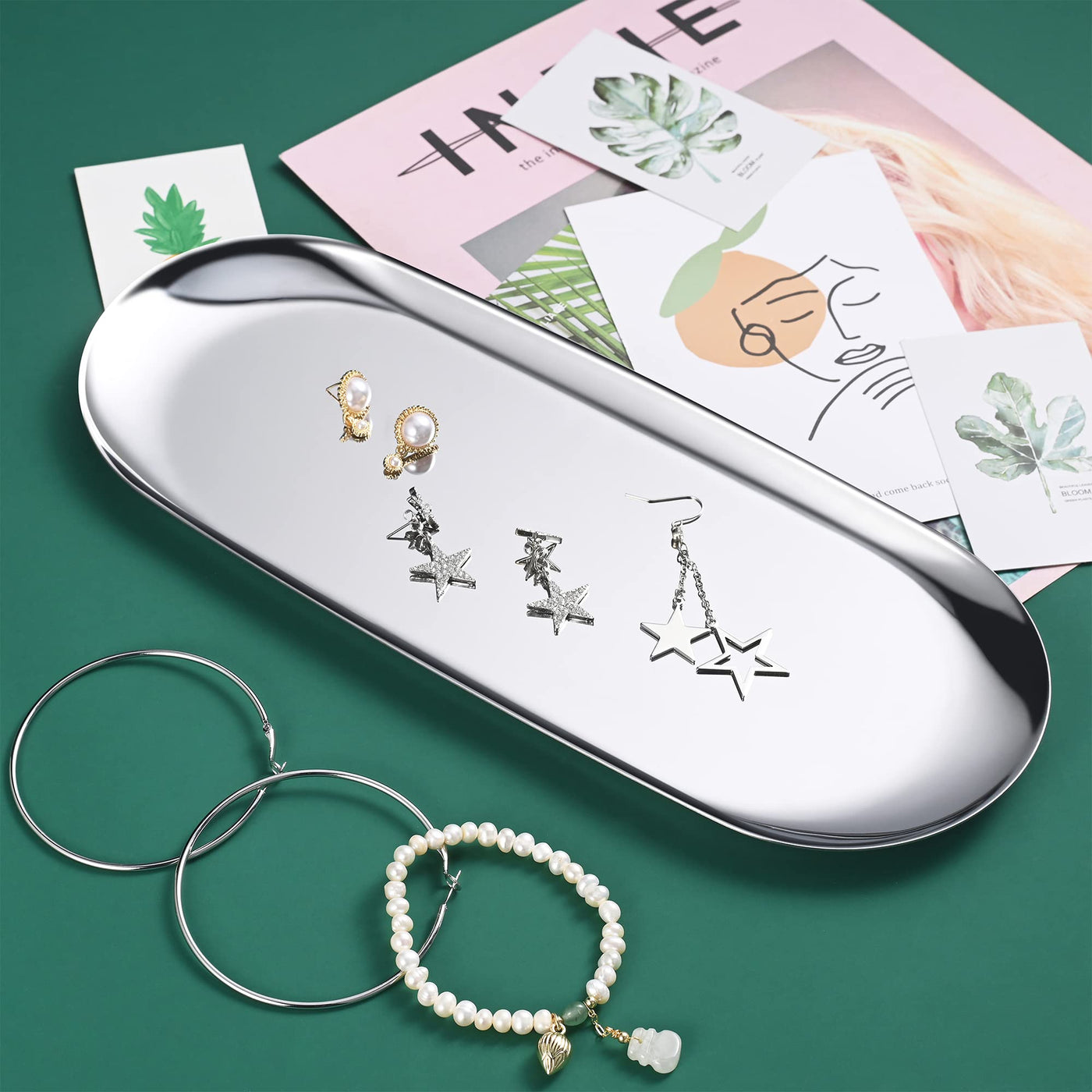 2 Pack Silver Oval Vanity Tray, Stainless Steel Jewelry Tray, Bathroom Tray, Makeup Cosmetic Trays,Towel Napkin Tray,Storage Org