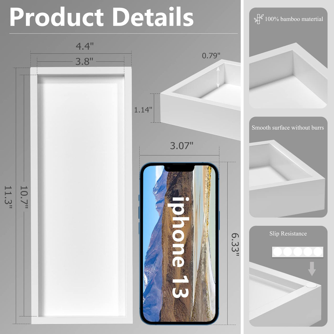 - Q: What are the dimensions of the Bathroom Vanity Tray? A: The Bathroom Vanity Tray measures 11.3 inches long, 4.4 inches wide, and 1.14 inches high.