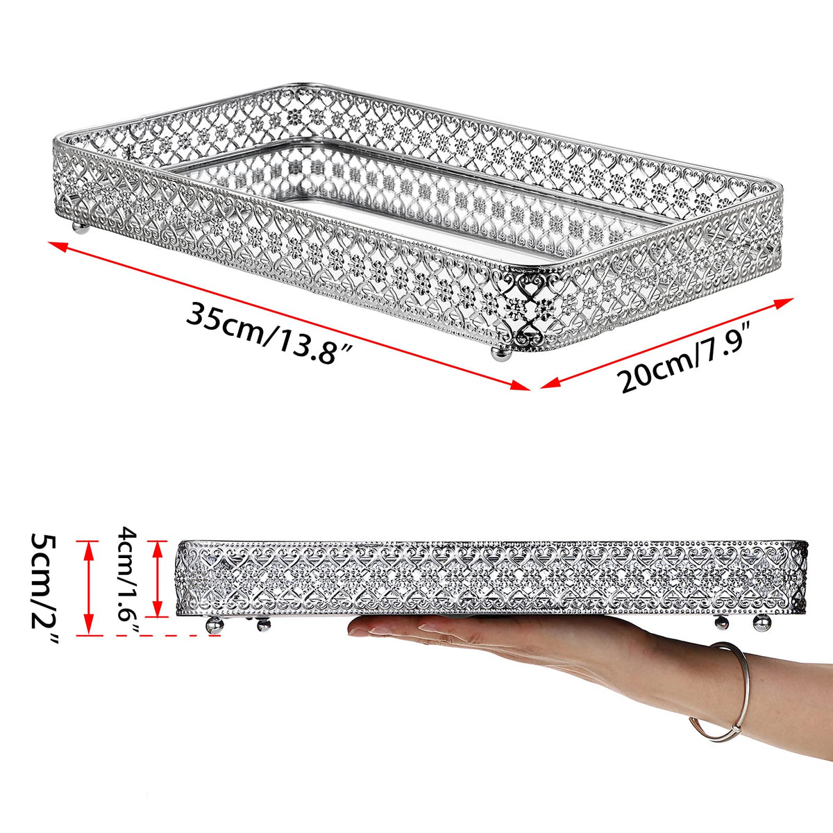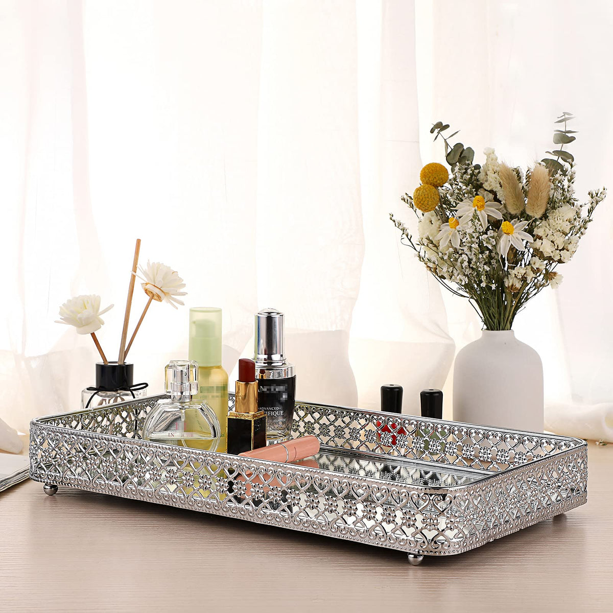 Elldoo Perfume Tray Mirror Tray Silver Vanity Makeup Hollow-Carved Jewelry Tray Glass Metal Trinket Storage Tray Home Decor Orga