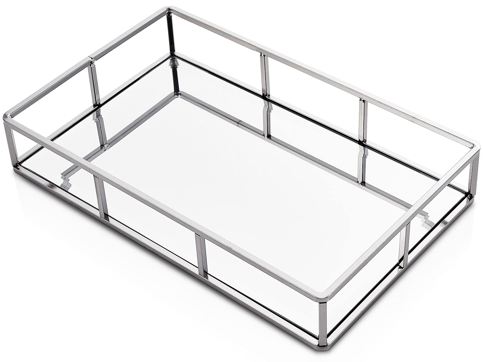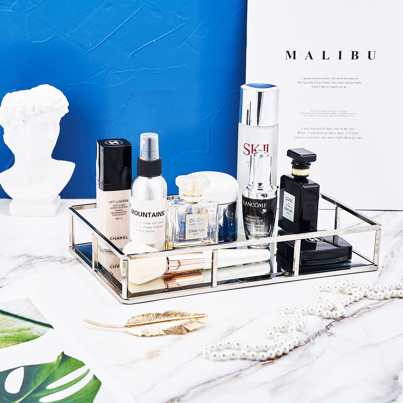 PuTwo Metal Vanity Jewelry Decor Mirror Tray Glass Perfume Organizer for Bathroom Counter Silver