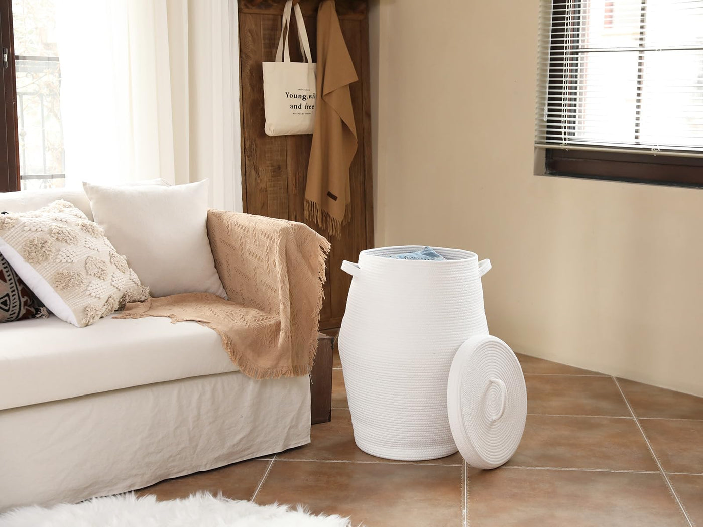 26'' X 20'' Tall Extra Large Storage Basket With Lid, Cotton Rope Storage Baskets, Woven Laundry Hamper With Cover, For Clothes