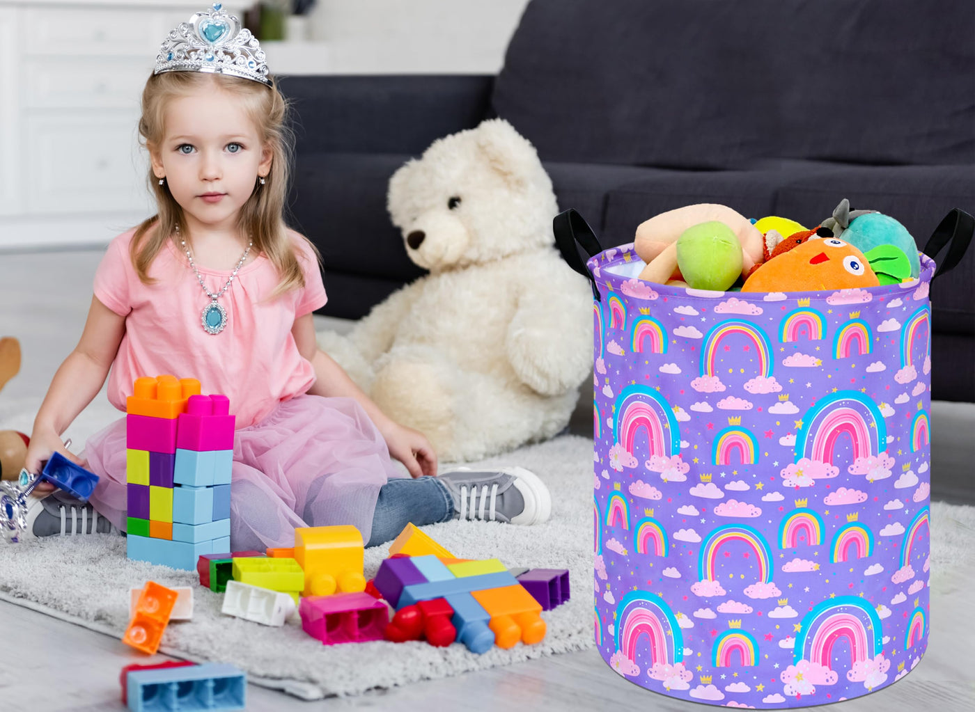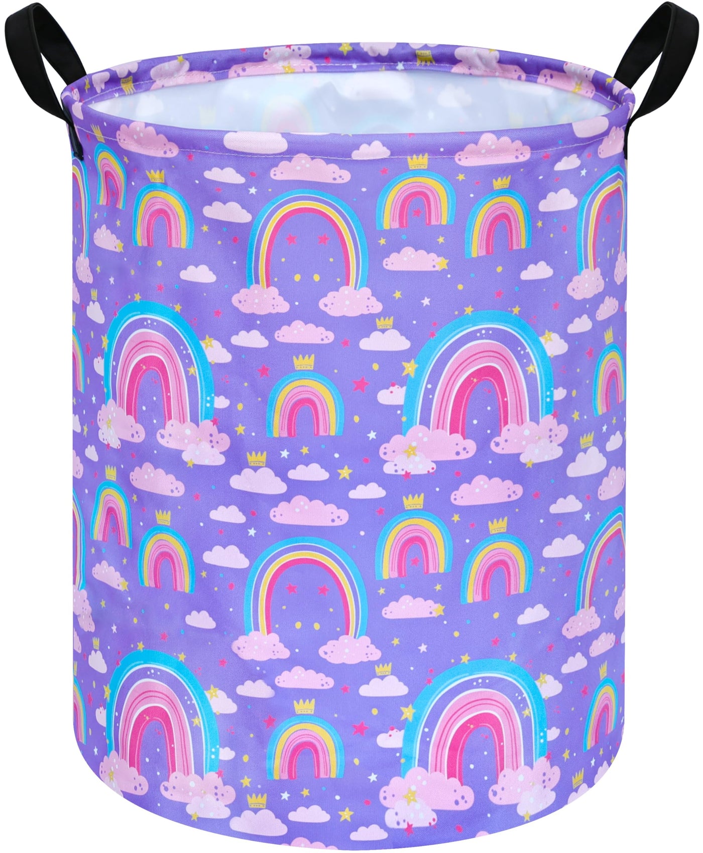 Acmuuni 19.7 Inch Purple Rainbow Round Kids Round Laundry Clothes Hamper Dino Laundry Basket With Handles,Baby Toys Storage Orga
