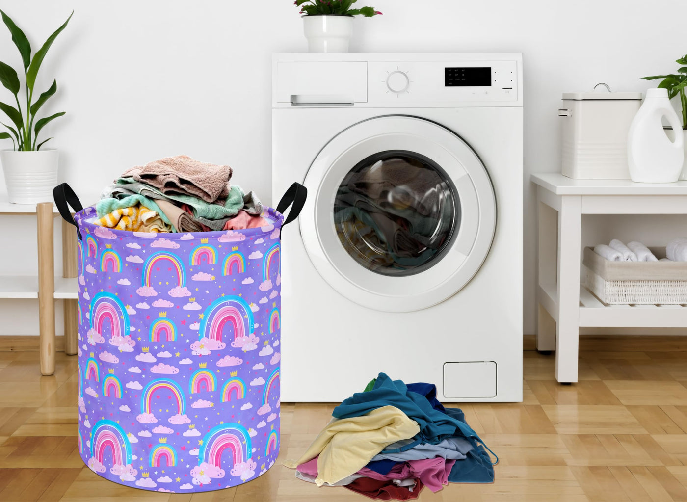 - Q: What colors are available for the ACMUUNI laundry hamper? A: The ACMUUNI laundry hamper features a purple rainbow design, making it visually appealing for kids' rooms.
