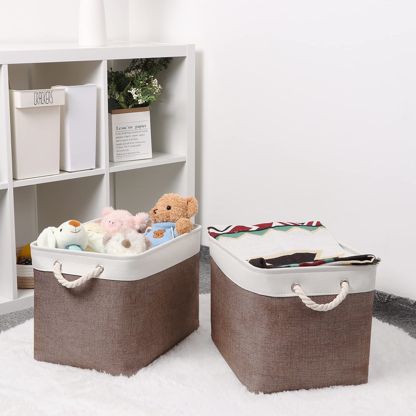 • Q: Do the baskets come with handles for easy transport? A: Yes, the baskets feature sturdy cotton rope handles on both sides for convenient moving and retrieval.