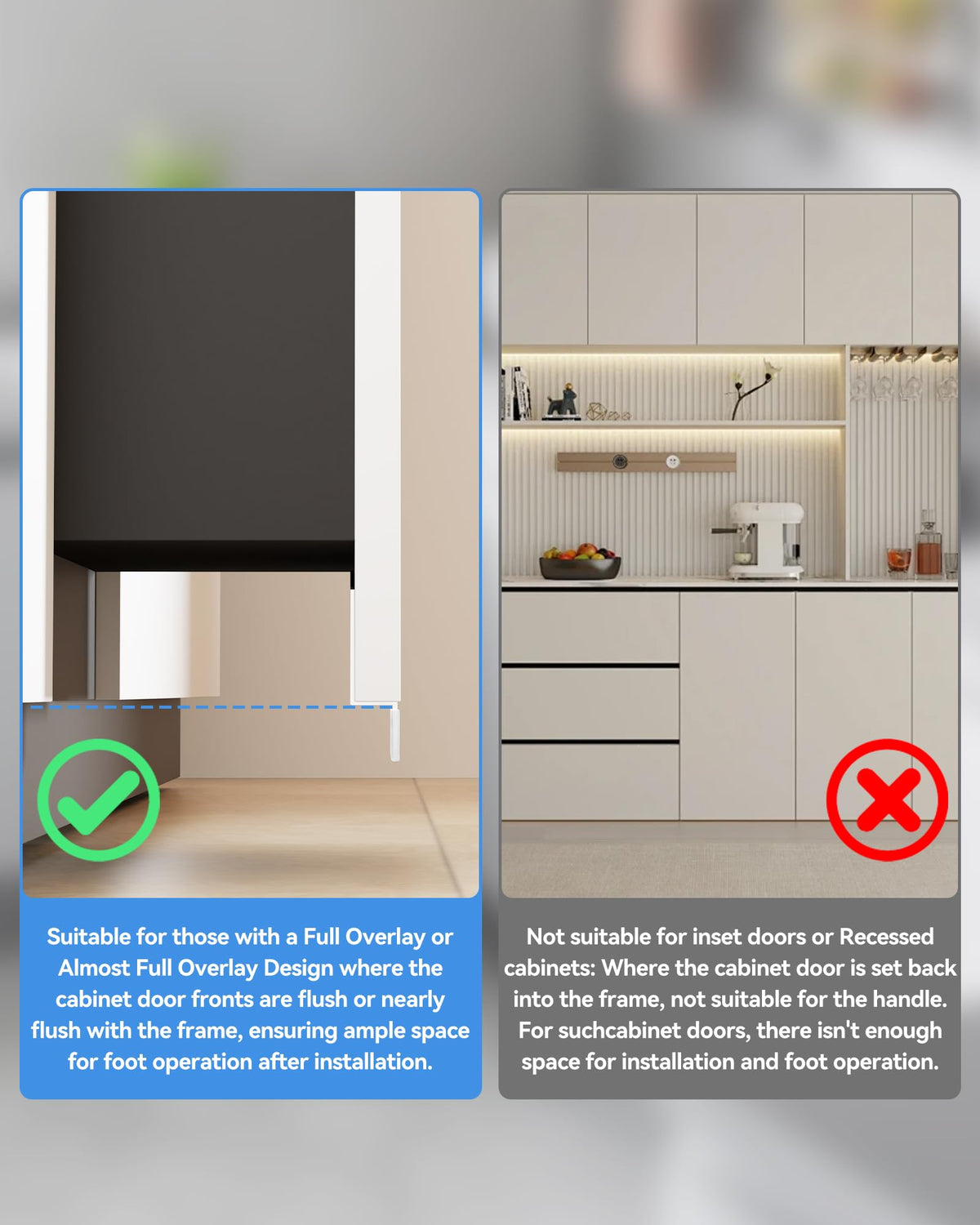 - Q: Is this foot pull suitable for all cabinet types? A: No, the foot pull is designed specifically for full overlay or almost full overlay cabinets. It is not suitable for inset or recessed cabinets where the door is set back from the frame.