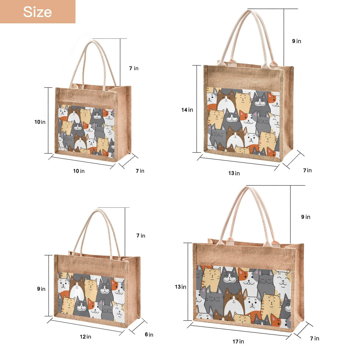 - Q: What sizes are available for the CaTaKu Cats Funny Jute Tote Bags? A: The CaTaKu Cats Funny Jute Tote Bags are available in four sizes: 10" x 10" x 7", 13" x 14" x 7", 12" x 9" x 6", and 17" x 13" x 7".
