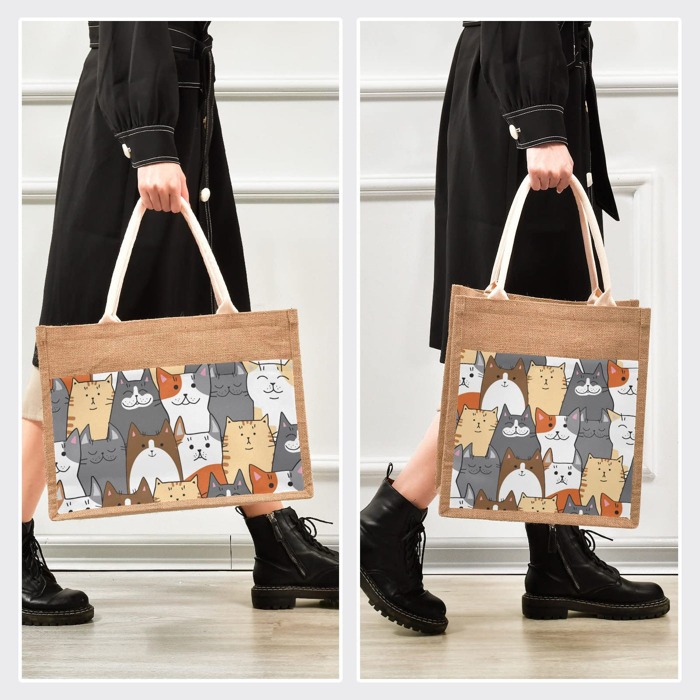 Cataku Cats Funny Jute Tote Bags With Handles & Zipper Reusable Shopping Grocery Bags Burlap Bags With Front Canvas Pocket Gift
