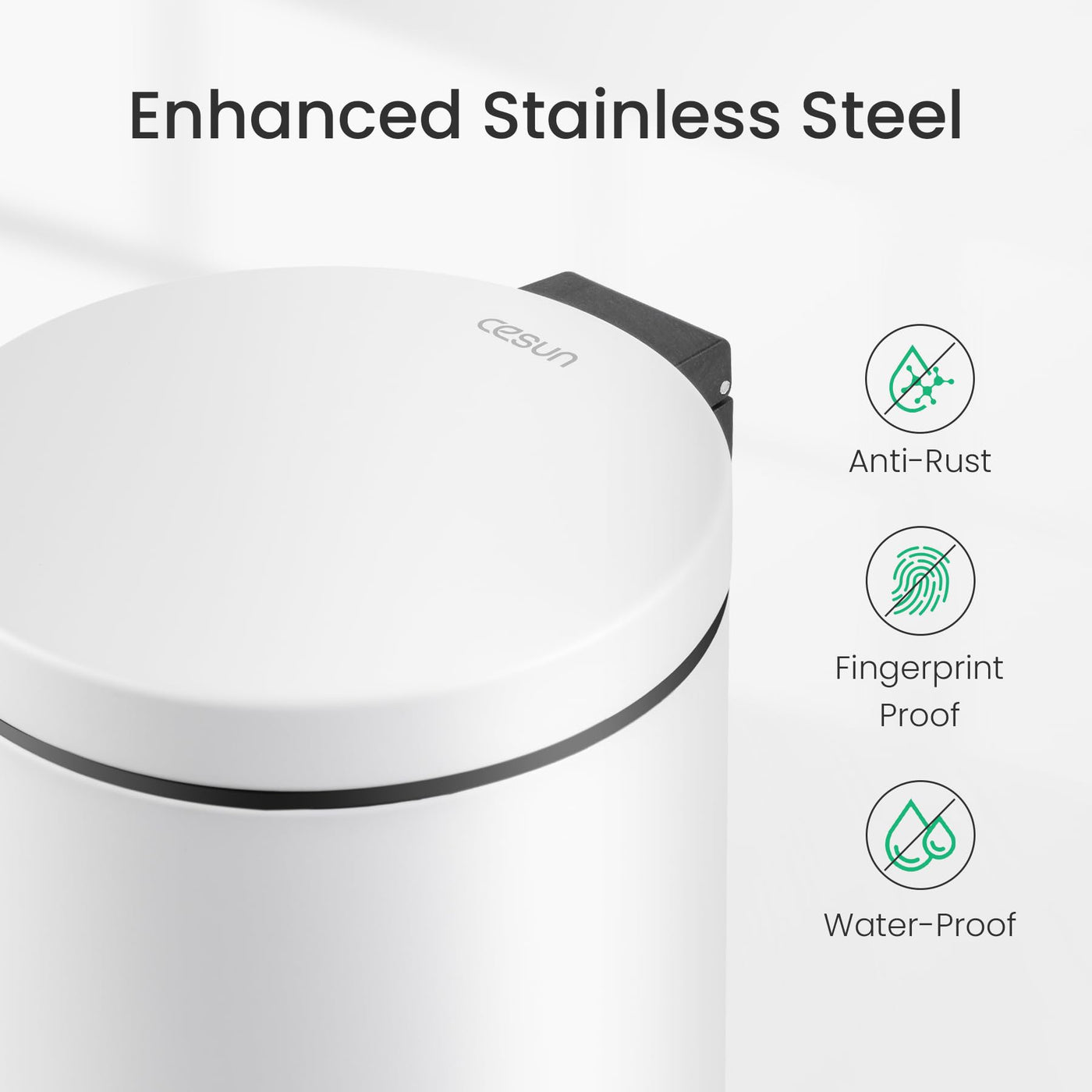 - Q: What color is the Cesun Trash Can? A: The Cesun Trash Can is primarily white, offering a clean and modern look that fits well in various settings.